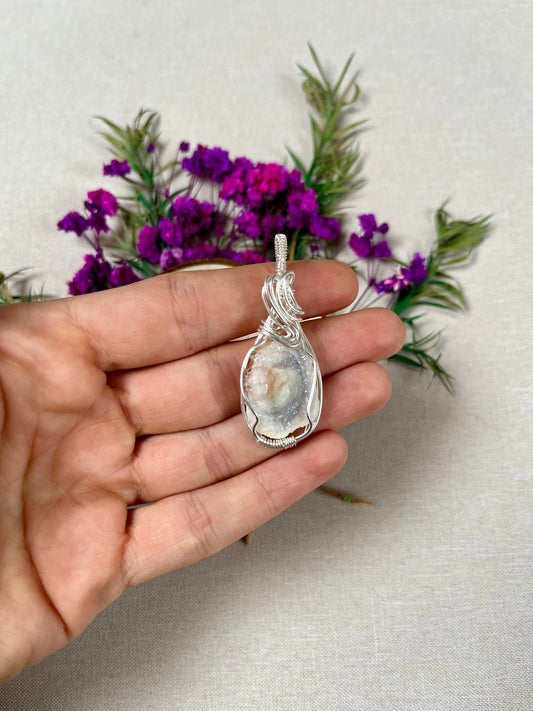 Calcedon Rohstein Anhänger – handgemachtes Unikat in 925er Silberdraht