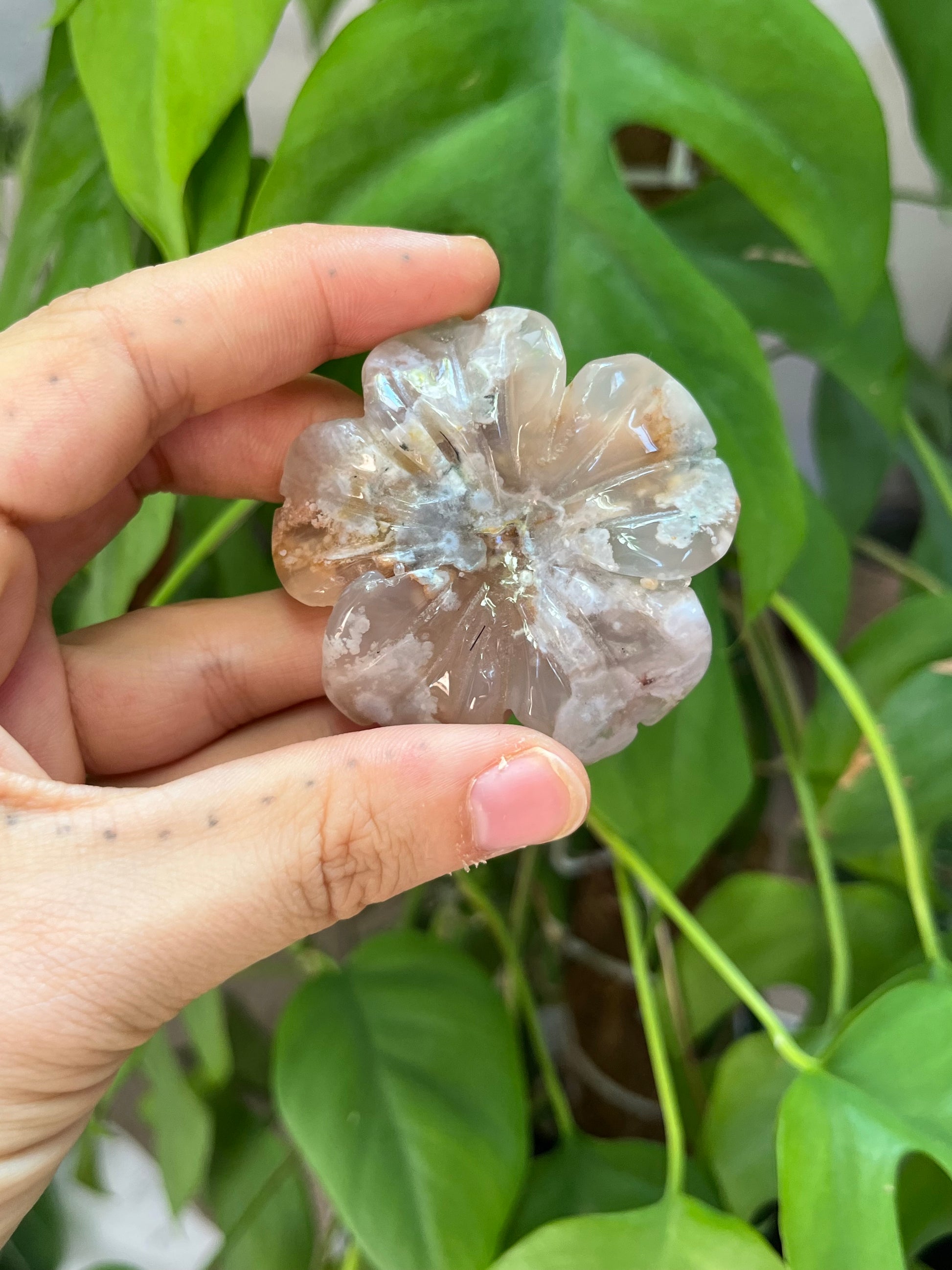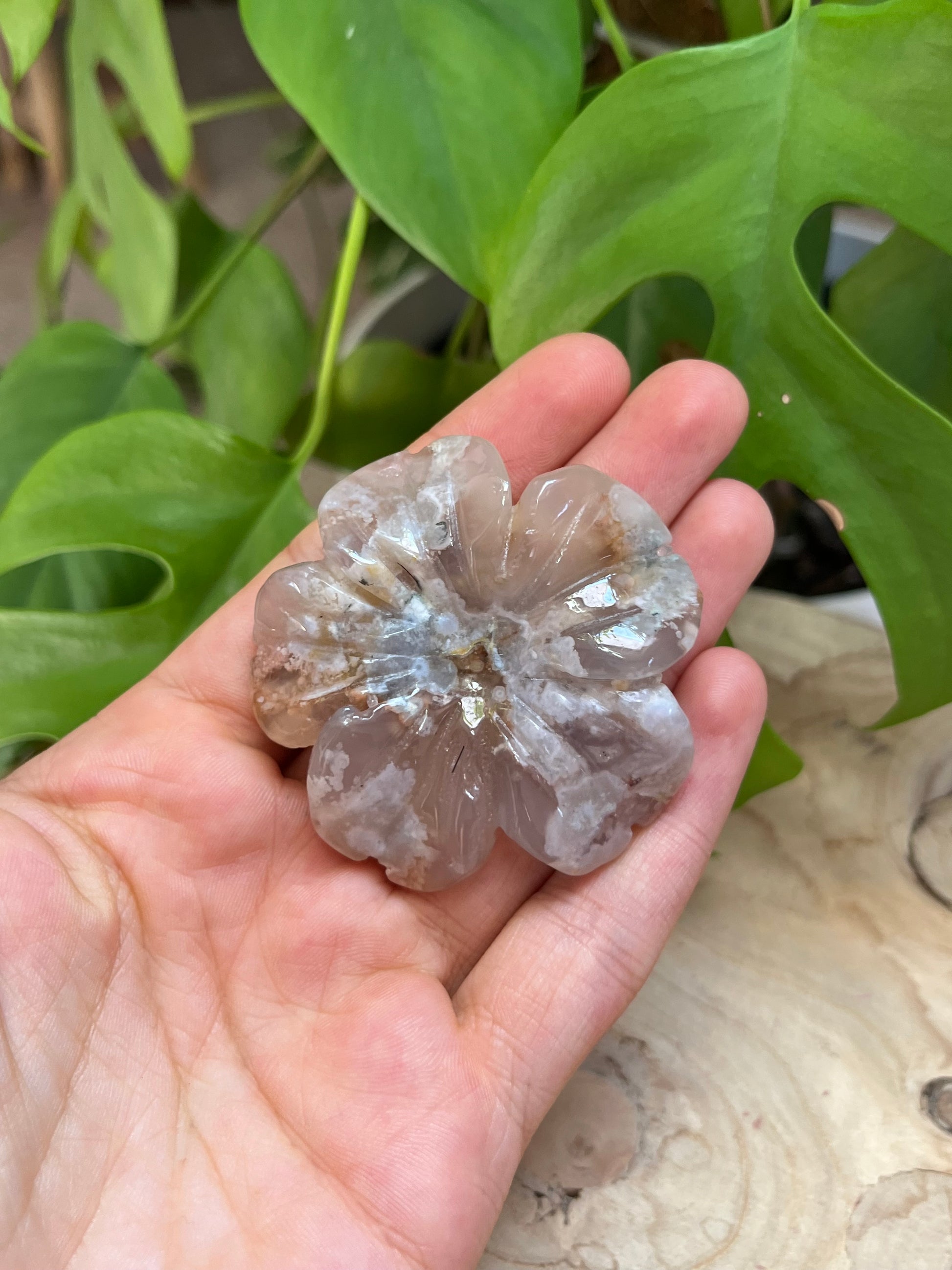 Blumenachat wird traditionell mit persönlichem Wachstum, Harmonie und Lebensfreude in Verbindung gebracht. Die Blumenform verstärkt diese Symbolik und steht zusätzlich für Erblühen, Erneuerung und die Verbindung zur Natur.