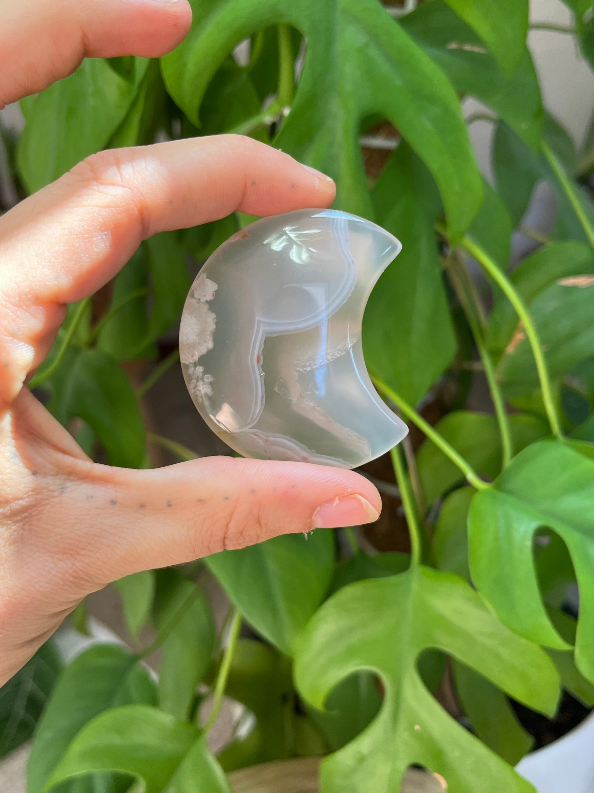 Blumenachat wird traditionell mit persönlichem Wachstum, Harmonie und Lebensfreude in Verbindung gebracht. In Mondform verstärkt sich die Symbolkraft zusätzlich – der Mond steht in vielen Kulturen für Intuition, Wandel und Zyklen des Lebens.