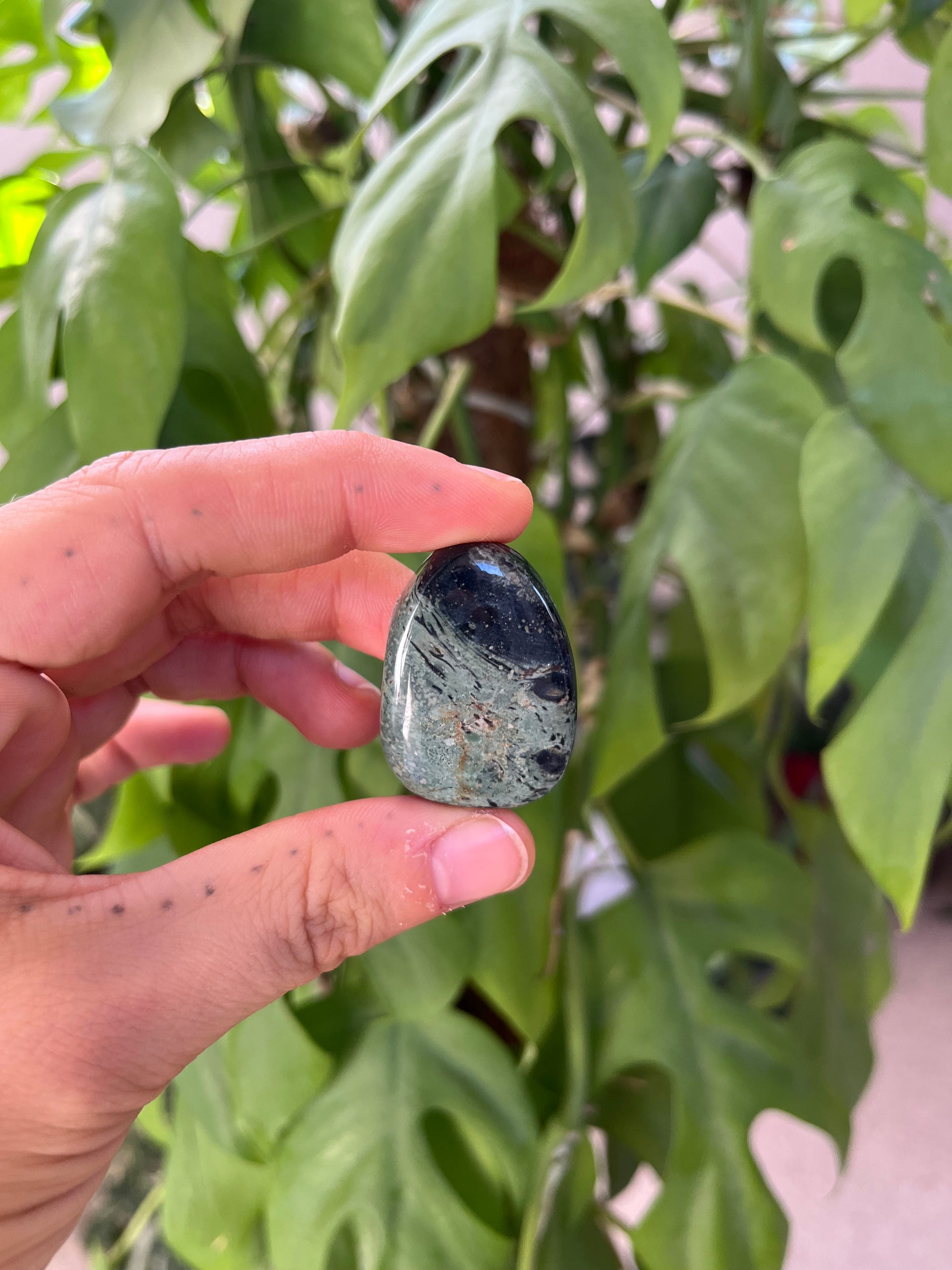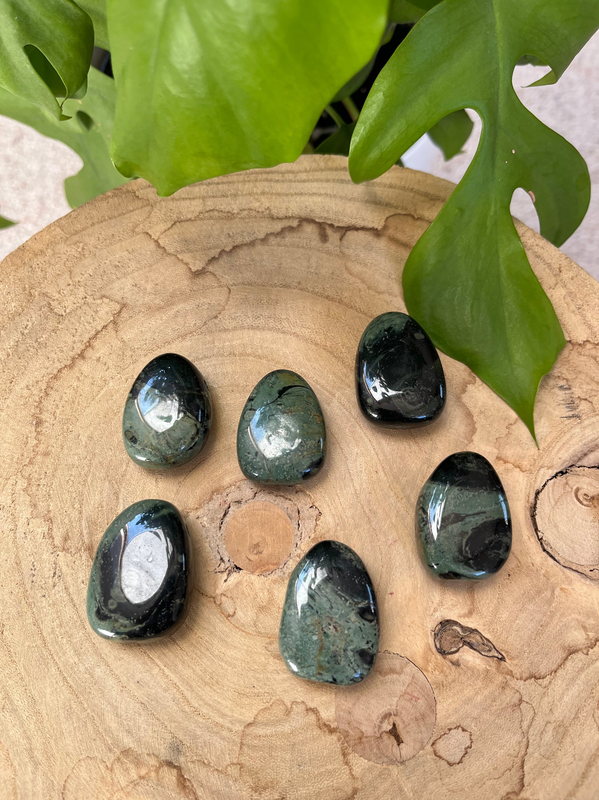 Dieser Eldarit Trommelstein – auch bekannt als Kabamba Rhyolith – wurde sorgfältig geschliffen und gebohrt, sodass er direkt als Anhänger getragen werden kann. Mit seinen kräftigen Grün- und Schwarztönen sowie den typischen wirbel- und augenförmigen Mustern ist jedes Stück ein faszinierendes Natur-Unikat.