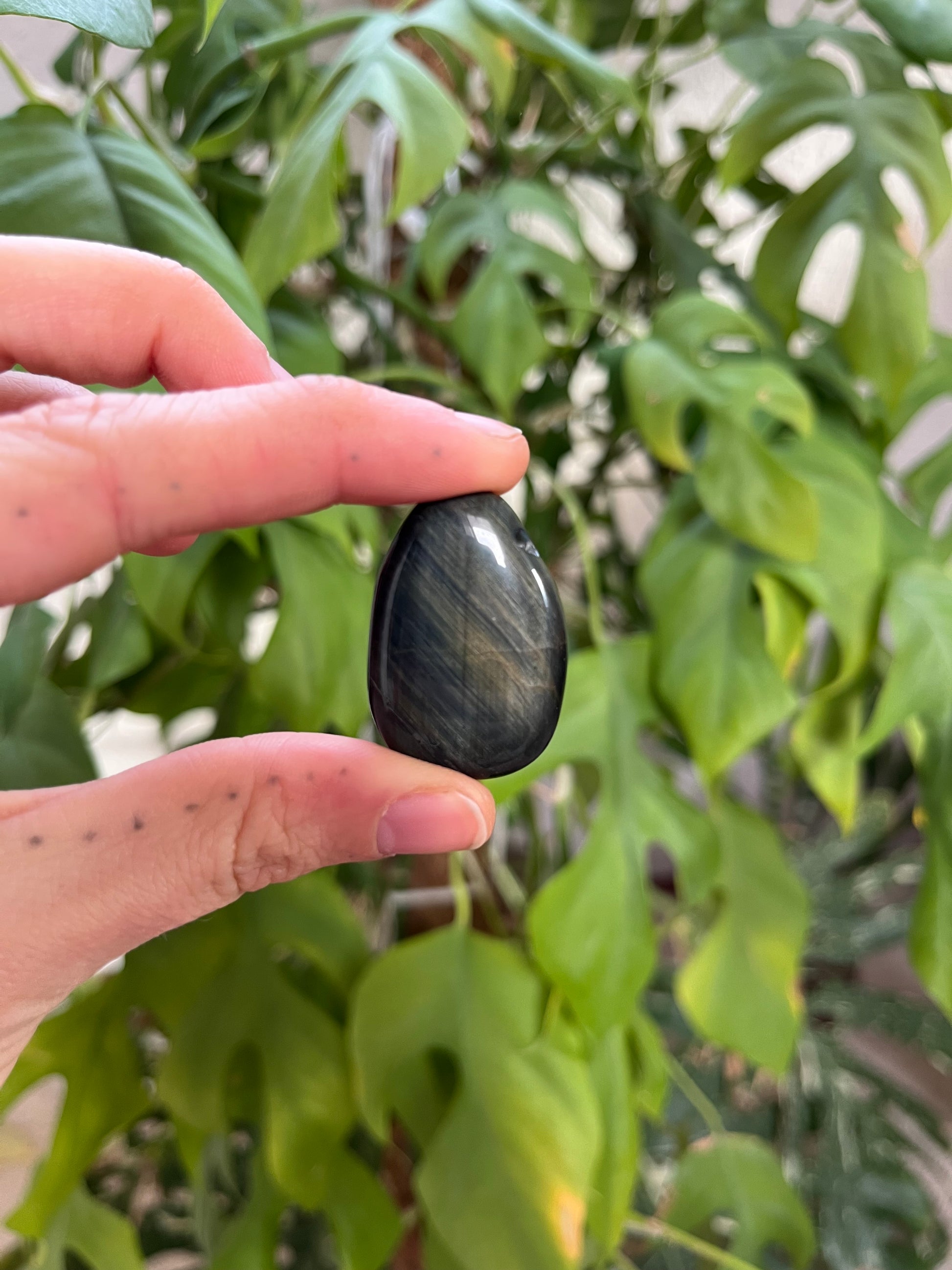 Dieser gebohrte Falkenauge Trommelstein begeistert durch seinen charakteristischen, seidigen Schimmer in Blau- und Grautönen. Je nach Lichteinfall zeigt sich der typische Chatoyance-Effekt, der dem Stein eine lebendige Tiefe verleiht. Durch die Trommelung liegt er angenehm glatt in der Hand und betont die natürliche Struktur des Steins. Jeder Stein ist ein echtes Natur-Unikat.
