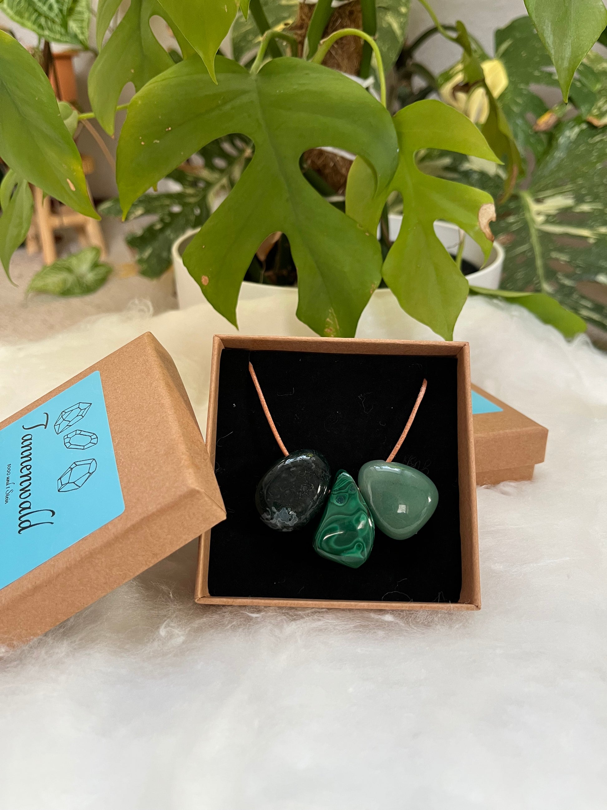 Unser Geschenk-Set „Tannenwald“ vereint drei wunderschöne Edelsteine, die die Ruhe, Magie und Schutzenergie eines tiefgrünen Winterwaldes einfangen: Moosachat, Malachit und Aventurin. Alle drei Steine sind gebohrt und können sofort als Anhänger getragen werden – einzeln oder im Wechsel.