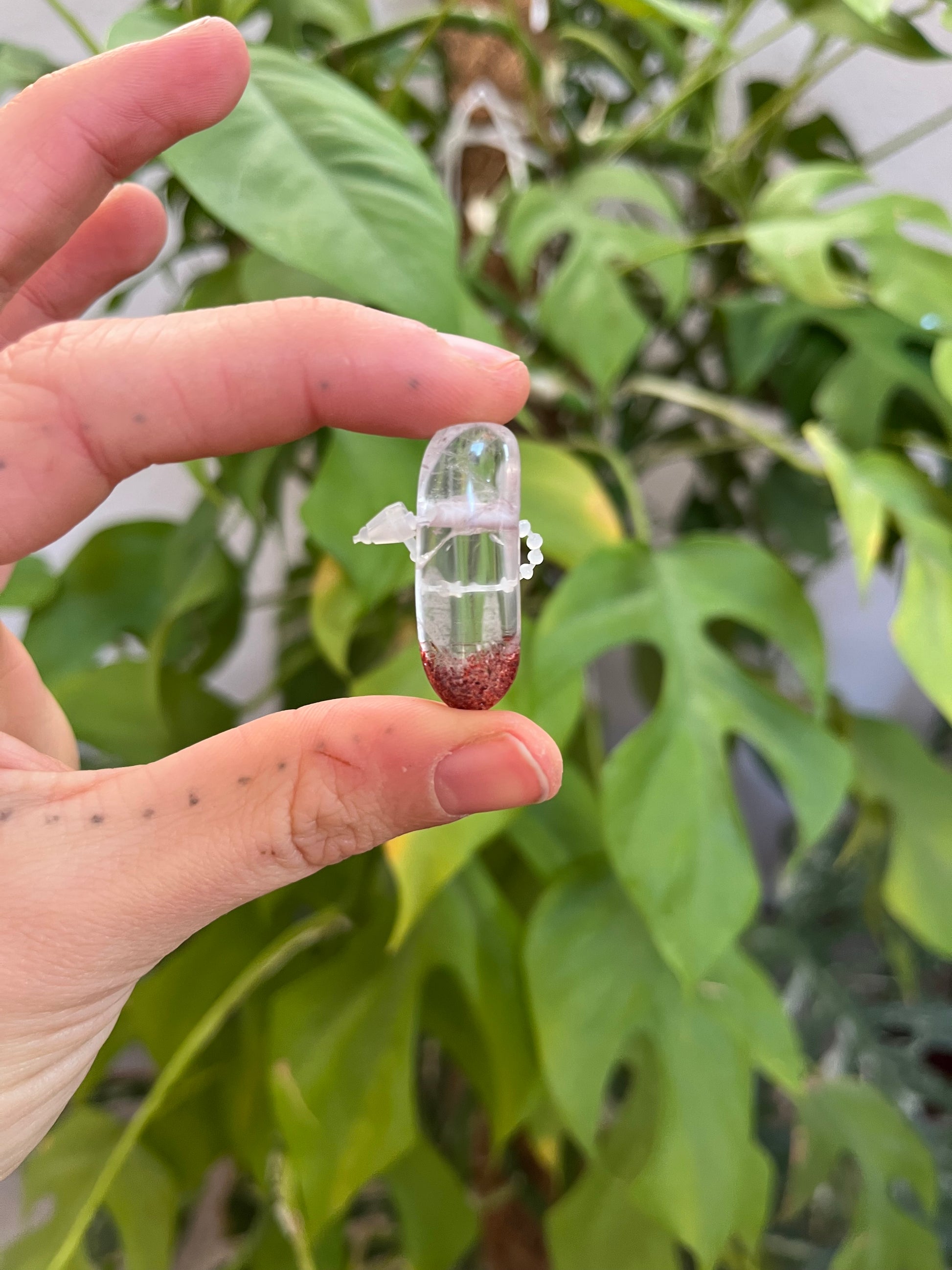 Dieser gebohrte Hämatit-Quarz Trommelstein vereint klaren Quarz mit feinen, rötlich-metallischen Hämatit-Einschlüssen. Die besondere Kombination sorgt für eine spannende Tiefe und eine lebendige, natürliche Zeichnung. Durch die Trommelung liegt der Stein angenehm in der Hand und zeigt seine Struktur besonders schön. Jeder Stein ist ein Natur-Unikat.