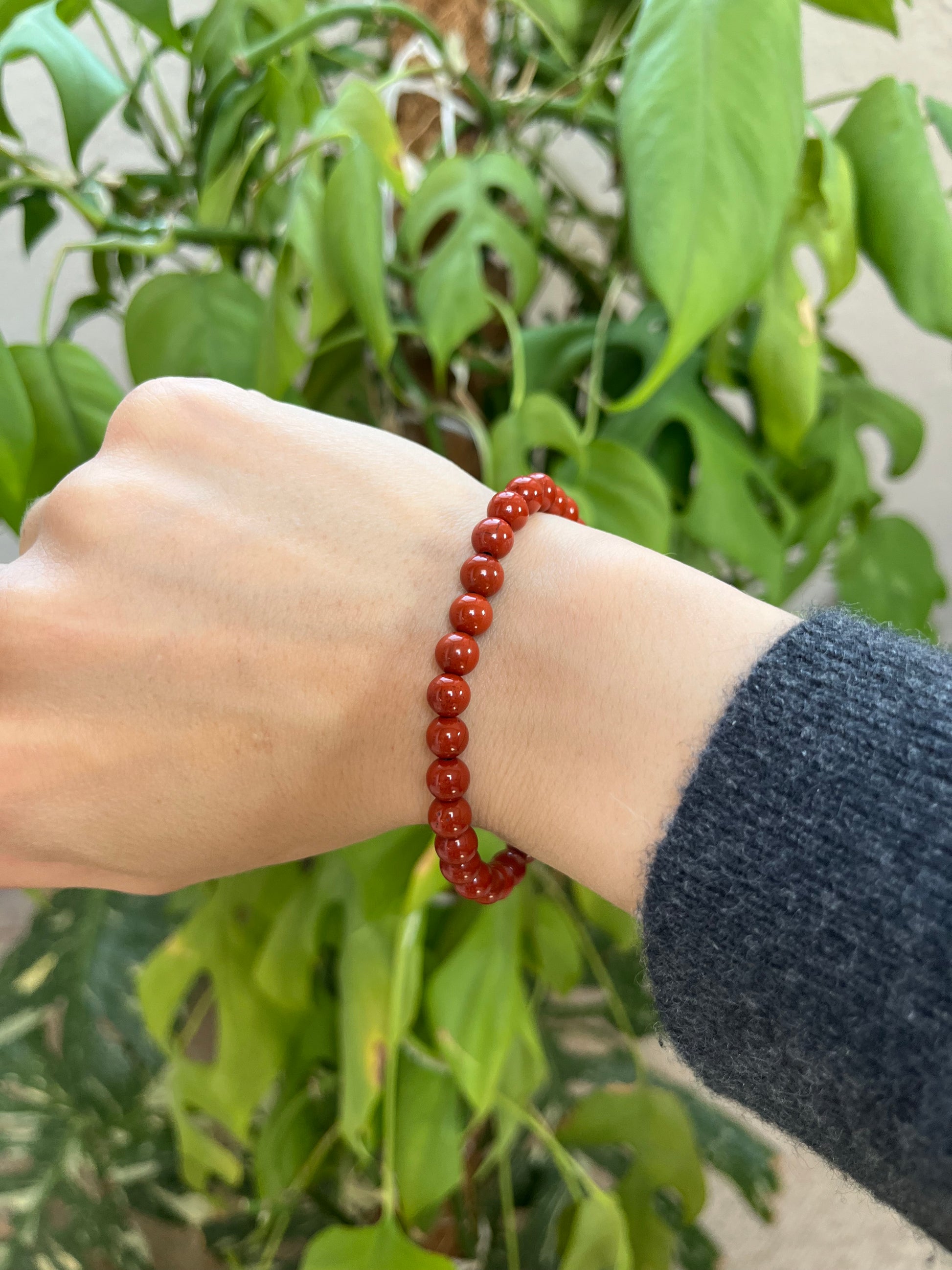 Dieses Armband aus rotem Jaspis besticht durch seine warme, kräftige Farbgebung in tiefen Rot- und Erdtönen. Die gleichmäßigen Kugelperlen verleihen dem Schmuckstück eine ruhige, kraftvolle Ausstrahlung und machen es zu einem zeitlosen Begleiter.