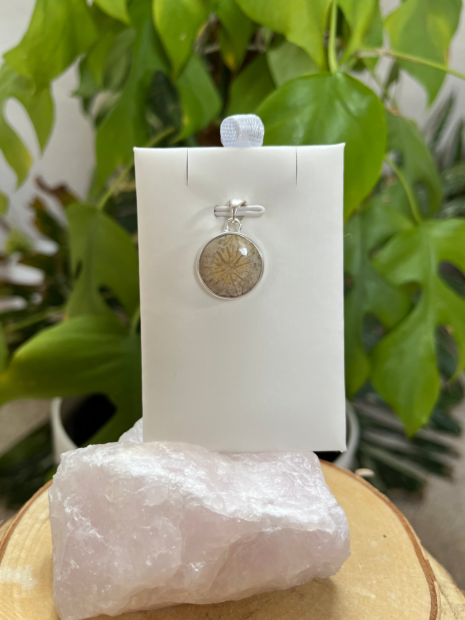 Die versteinerte Koralle wird traditionell mit Wandel, Erdung und Verbundenheit zur Natur in Verbindung gebracht. Ihre besondere Zeichnung macht jeden Anhänger zu einem ausdrucksstarken Einzelstück.