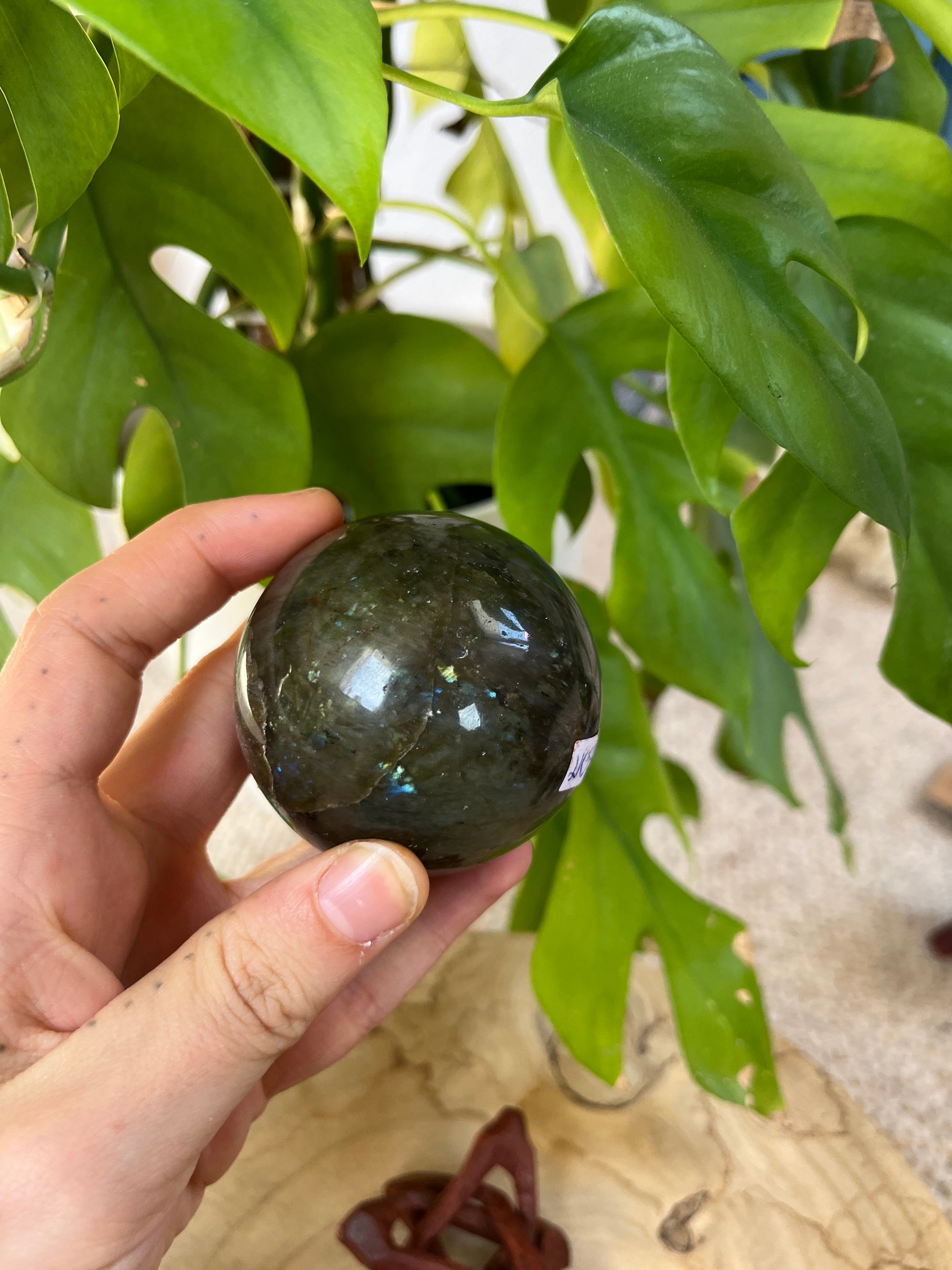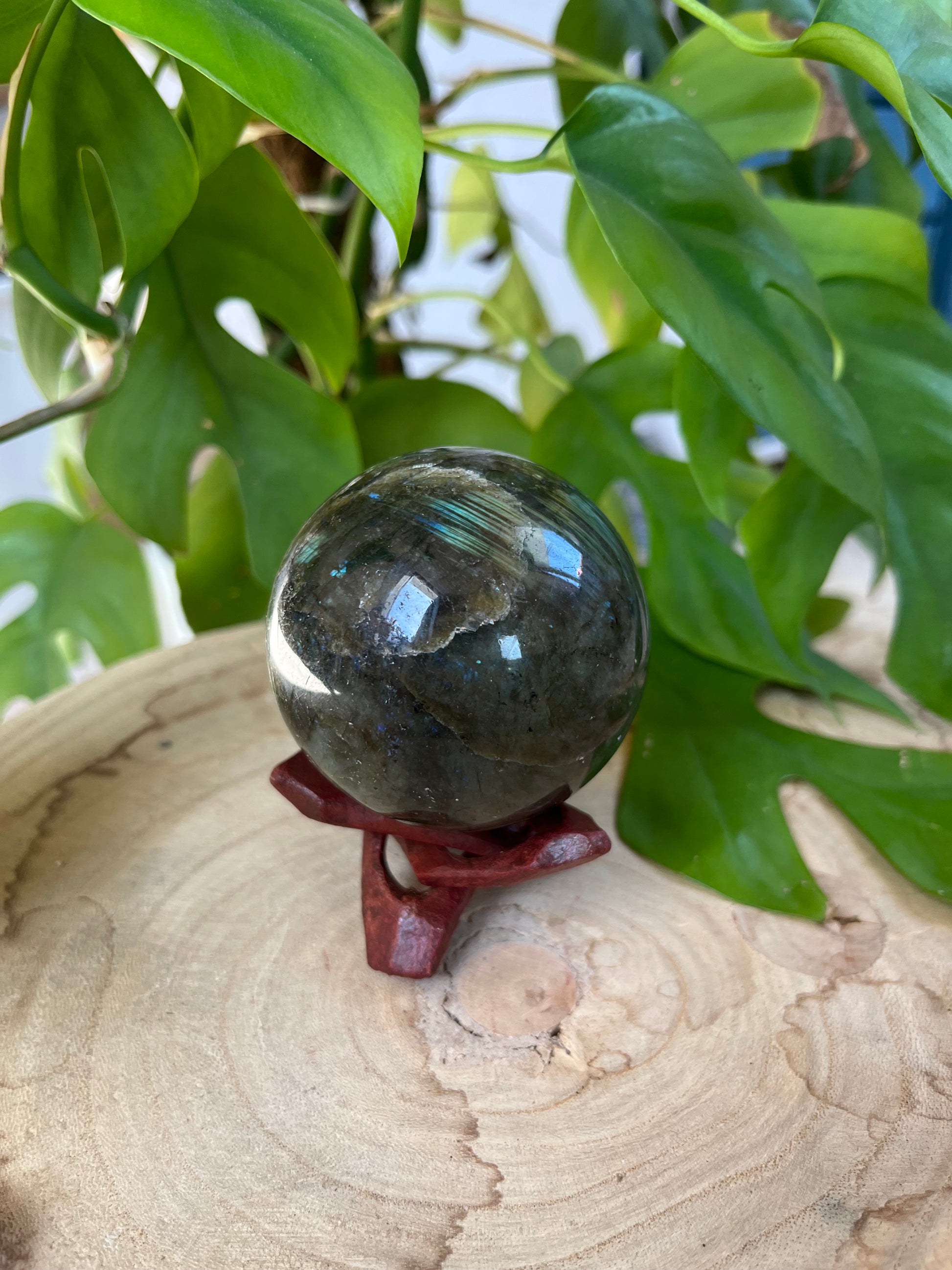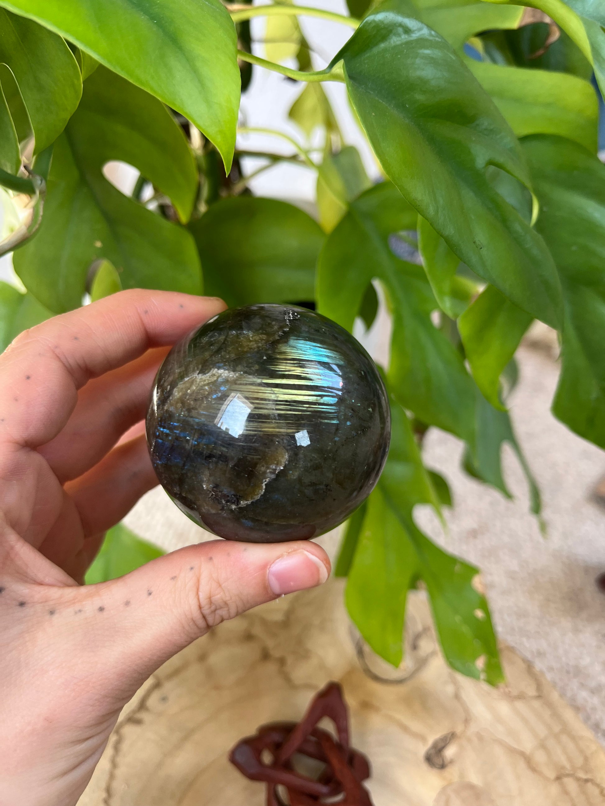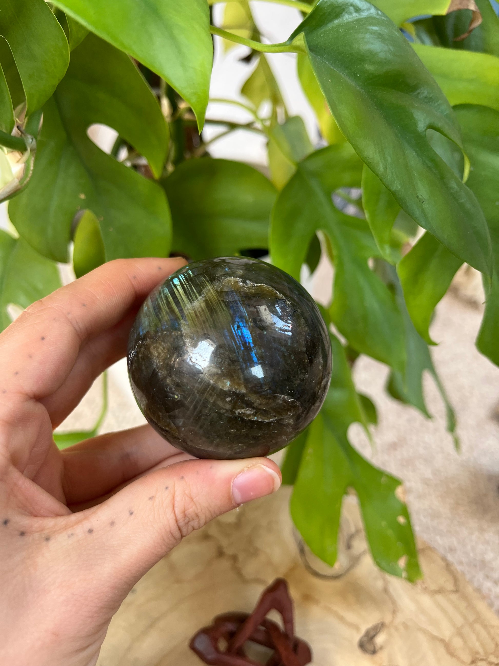 Diese glatt polierte Labradorit-Kugel (Ø ca. 6 cm, ca. 275 g) fasziniert mit ihrem magischen Schimmer – ein Spiel aus Blau, Grün und Gold, das sich je nach Lichteinfall verändert. Sie ist nicht nur ein Blickfang, sondern ein kraftvoller Begleiter für Meditation, Raumenergie oder deine spirituelle Praxis.