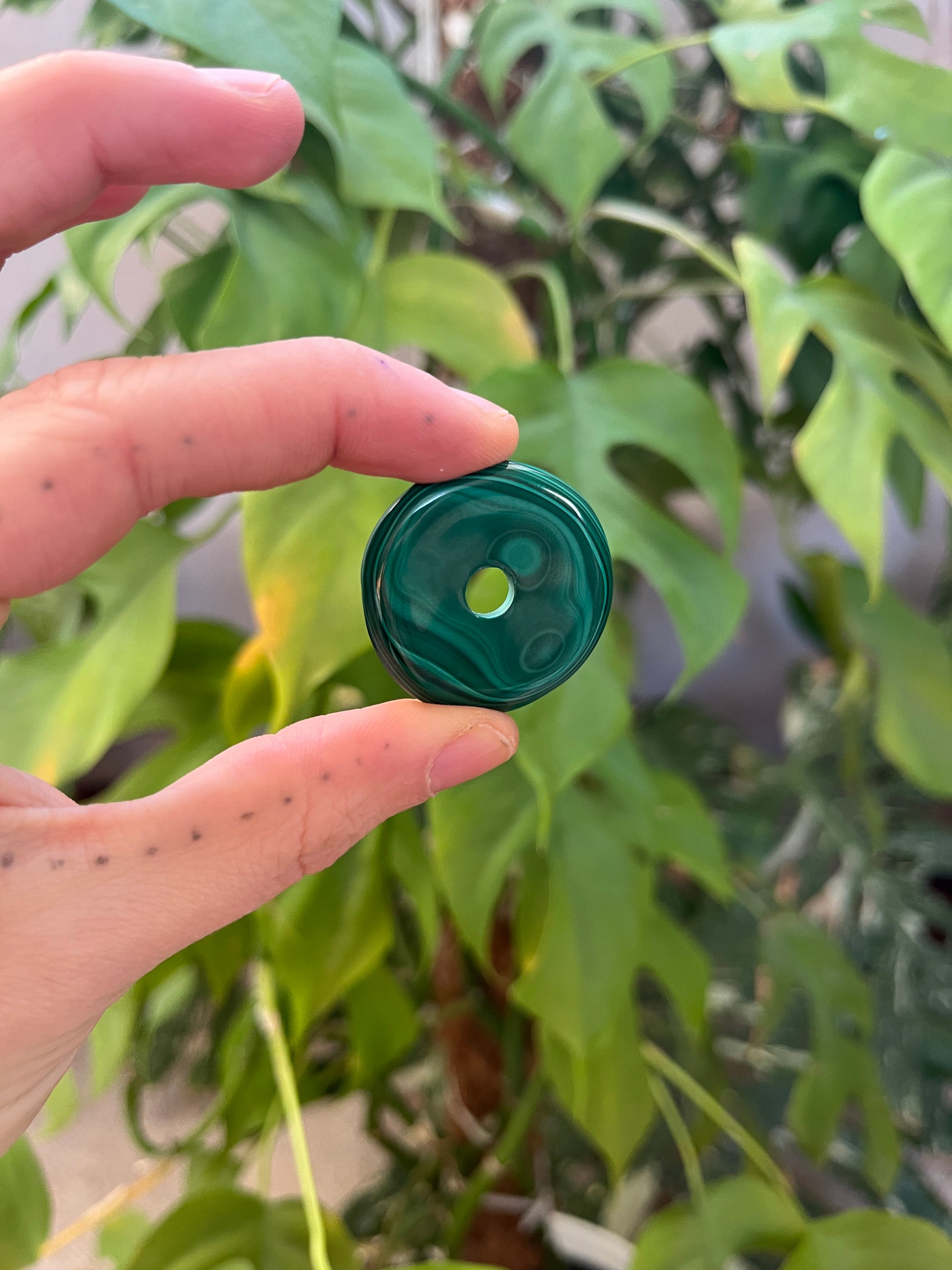 Der Malachit steht symbolisch für Wandel, Selbstausdruck und bewusste Veränderung. Die runde Donutform unterstreicht das Gefühl von Ganzheit und Ausgleich – ideal als Schmuckstück oder dekoratives Element. Jeder Donut ist ein Unikat der Natur.