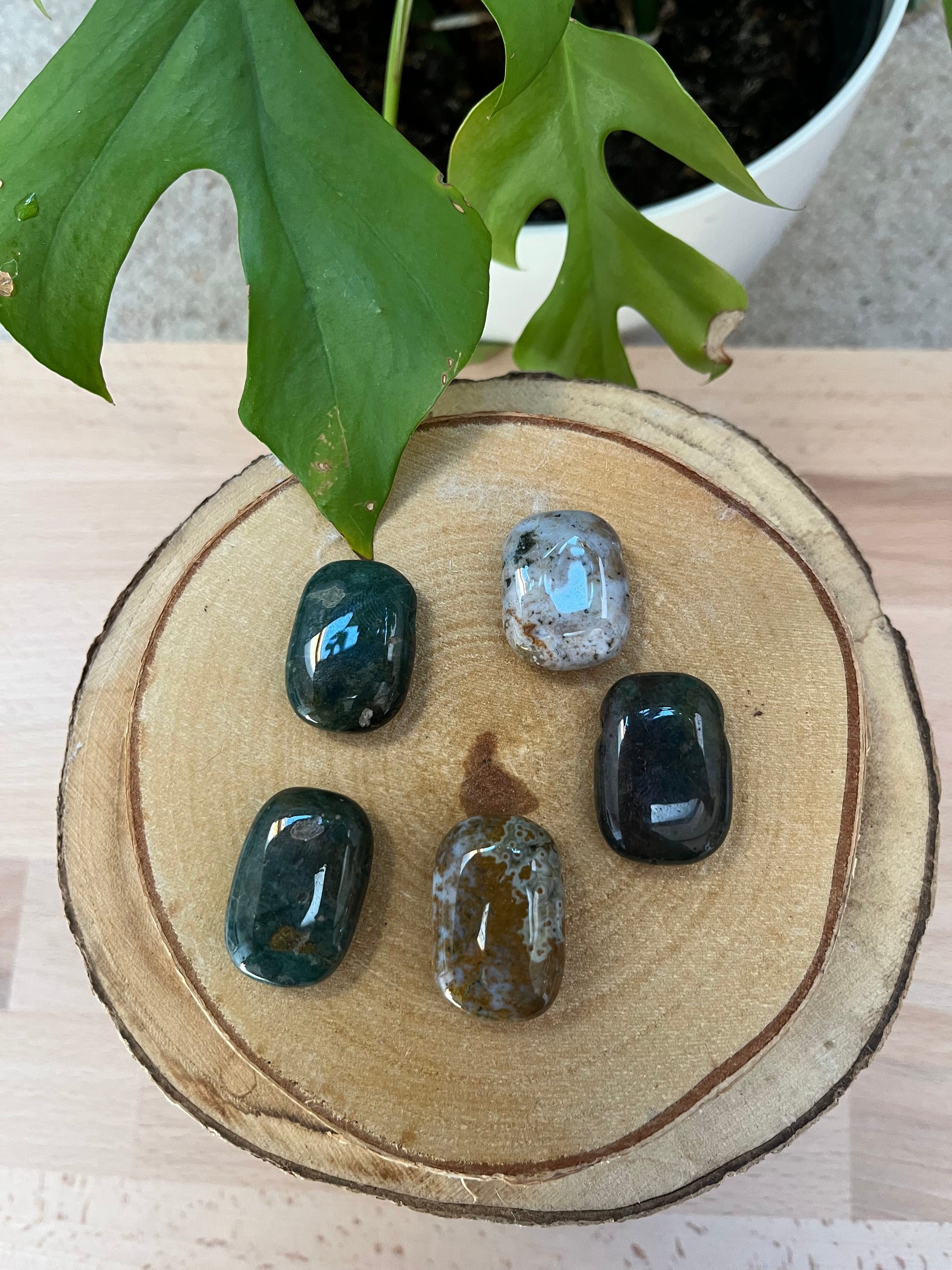 Dieser gebohrte Ozeanjaspis Trommelstein begeistert durch seine lebendige, oft kreisförmige Zeichnung in Grün-, Beige-, Creme- und Erdtönen. Die einzigartige Musterung erinnert an Meereslandschaften, Wellen und Korallenstrukturen und macht jeden Stein zu einem echten Natur-Unikat.