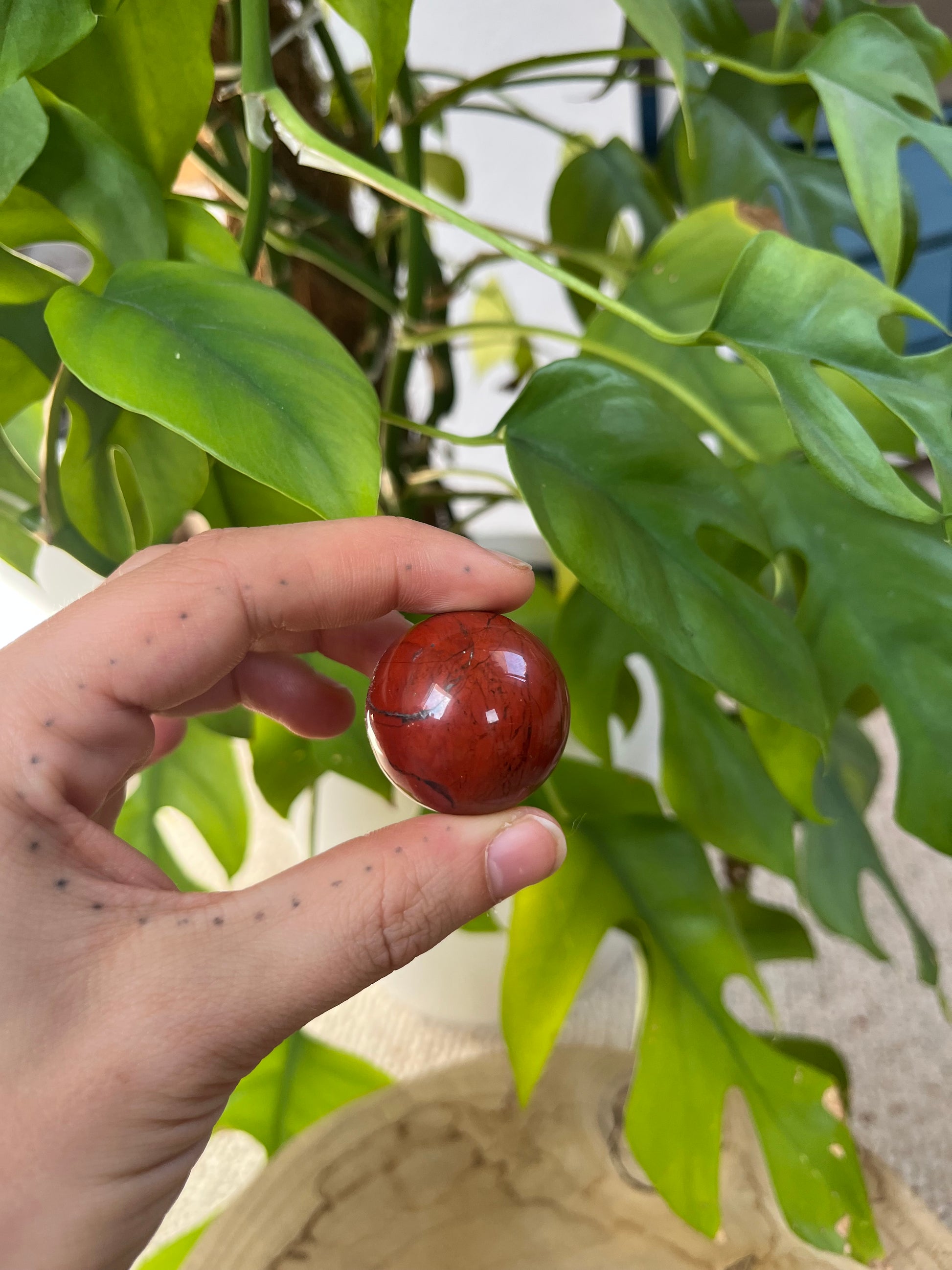 Diese glatt polierte Kugel aus rotem Jaspis liegt angenehm in der Hand und eignet sich wunderbar für Rituale, Meditation, als Handschmeichler oder zum Mitnehmen im Alltag. Der Rote Jaspis schenkt dir Stärke, Fokus und eine tiefe Verbindung zur Erde.
