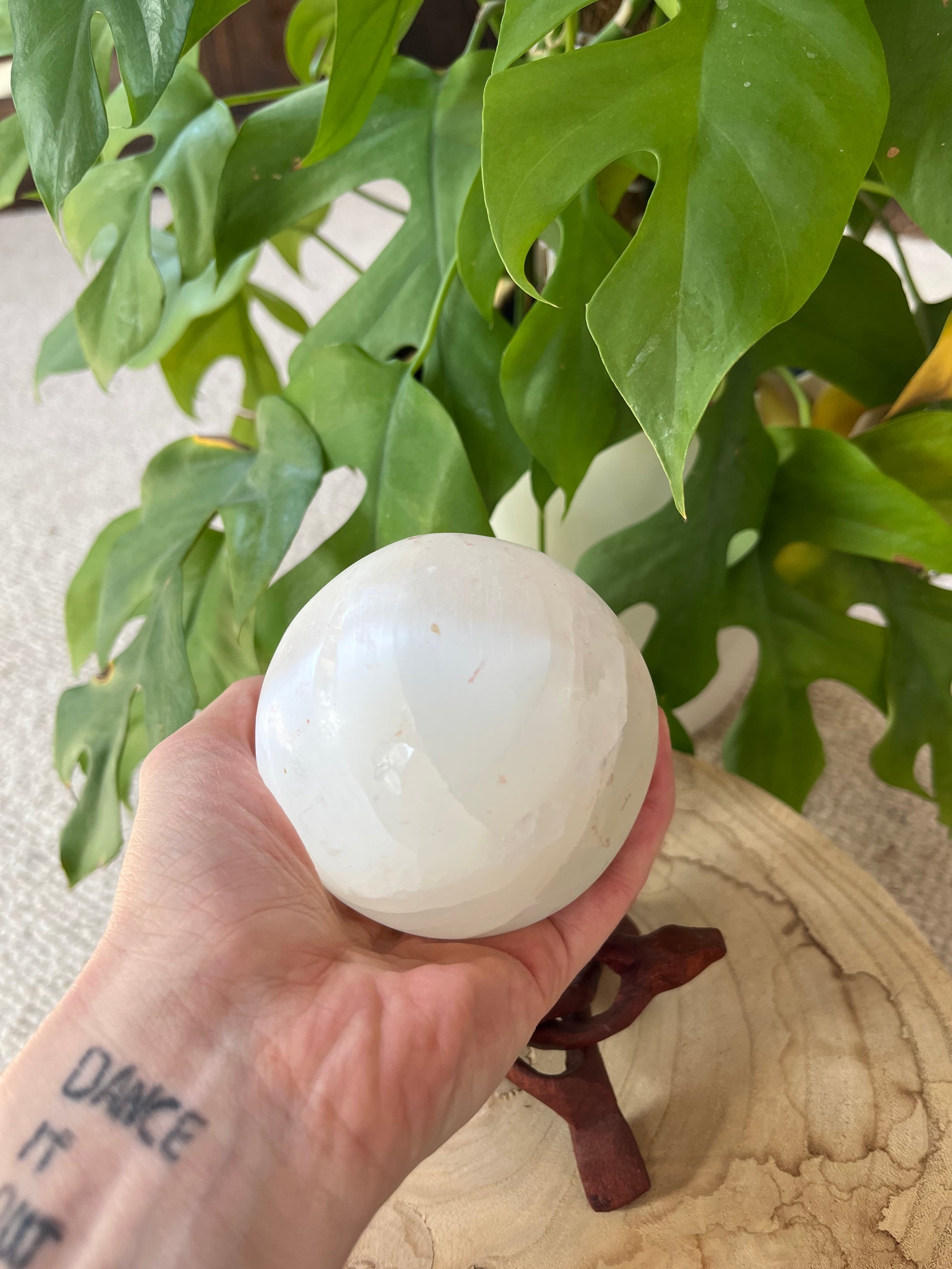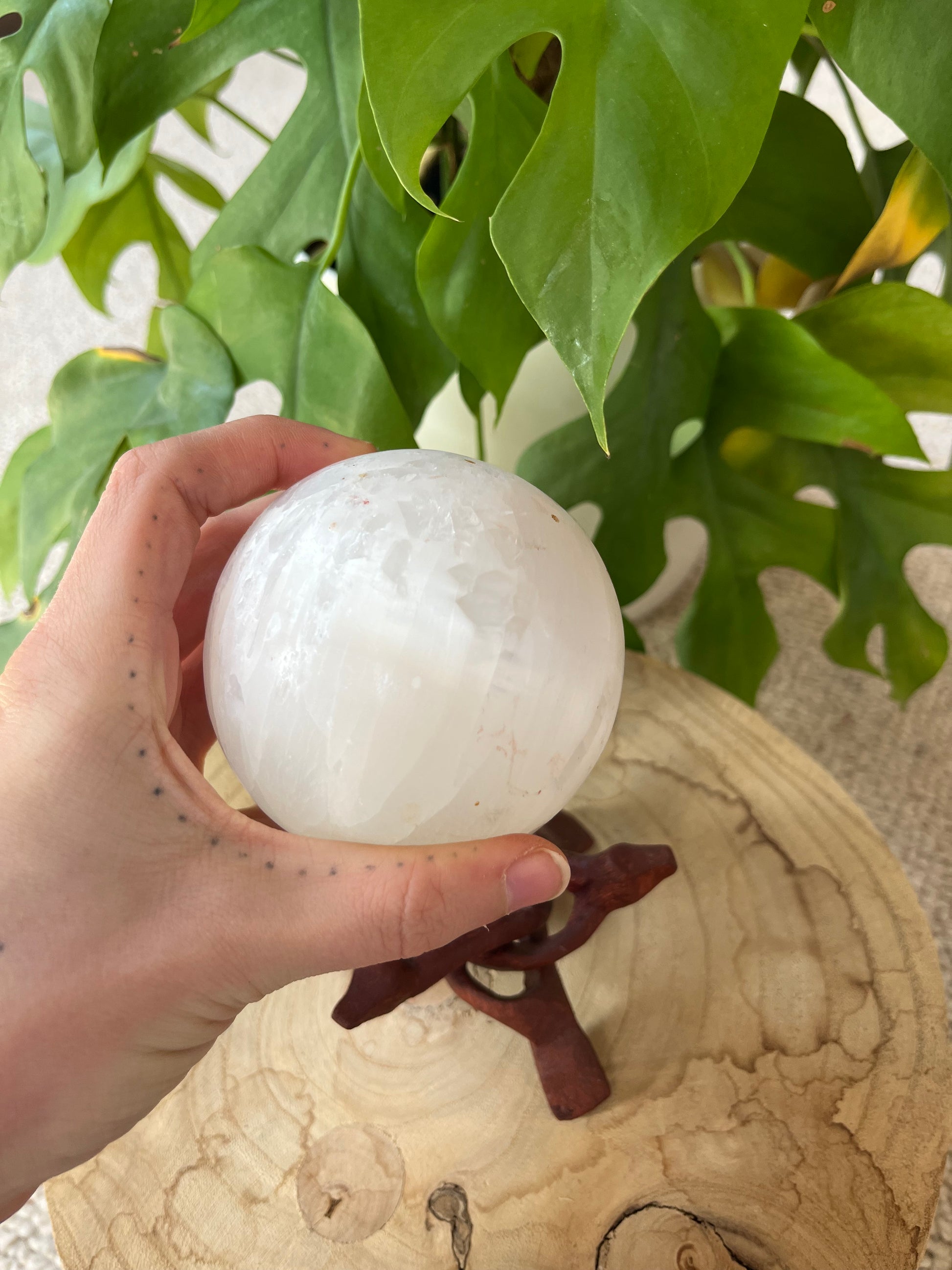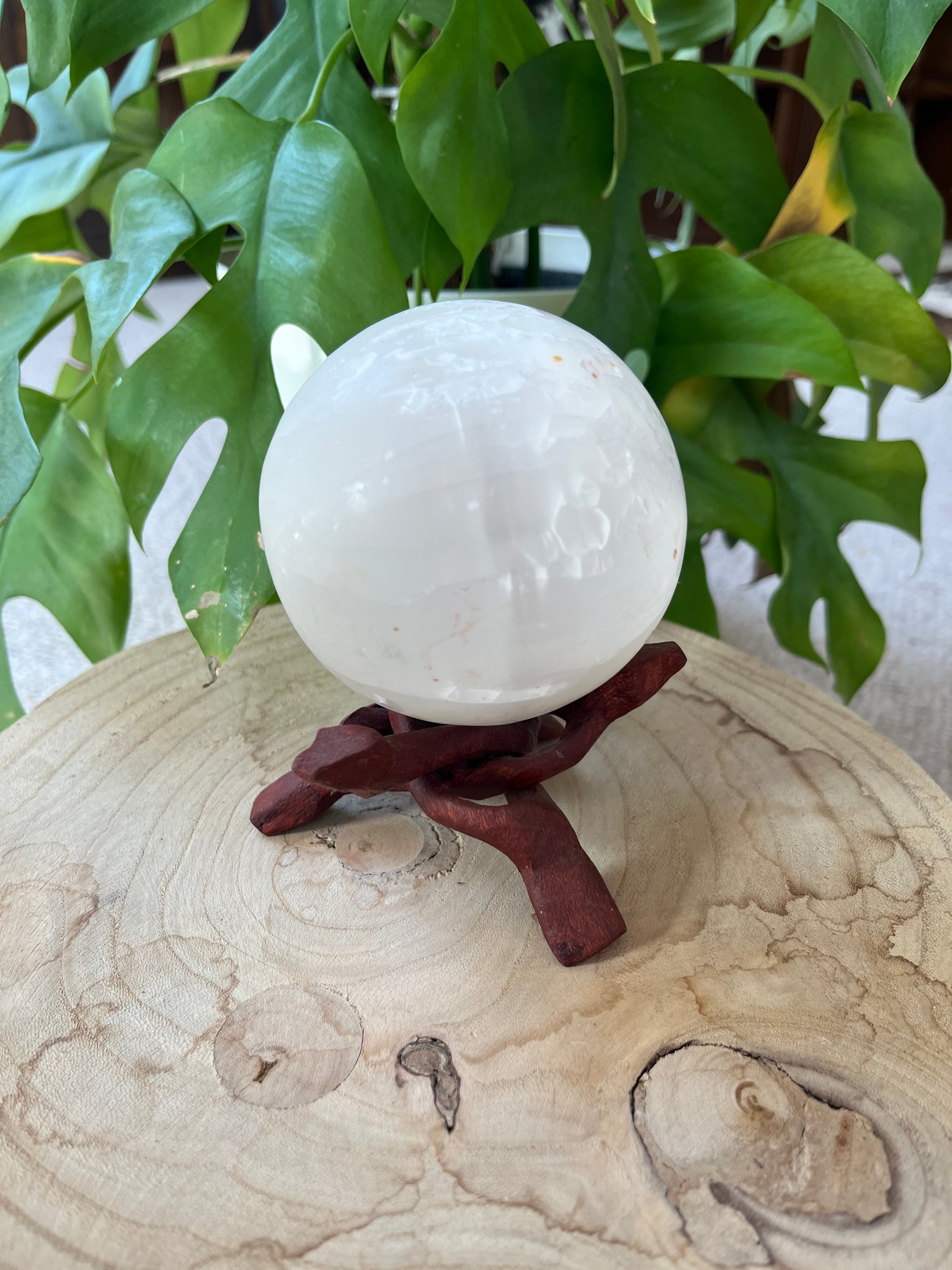 Weiße Selenit Kugel mit Holz Ständer. Umfang 25cm Durchmesser 7,95cm