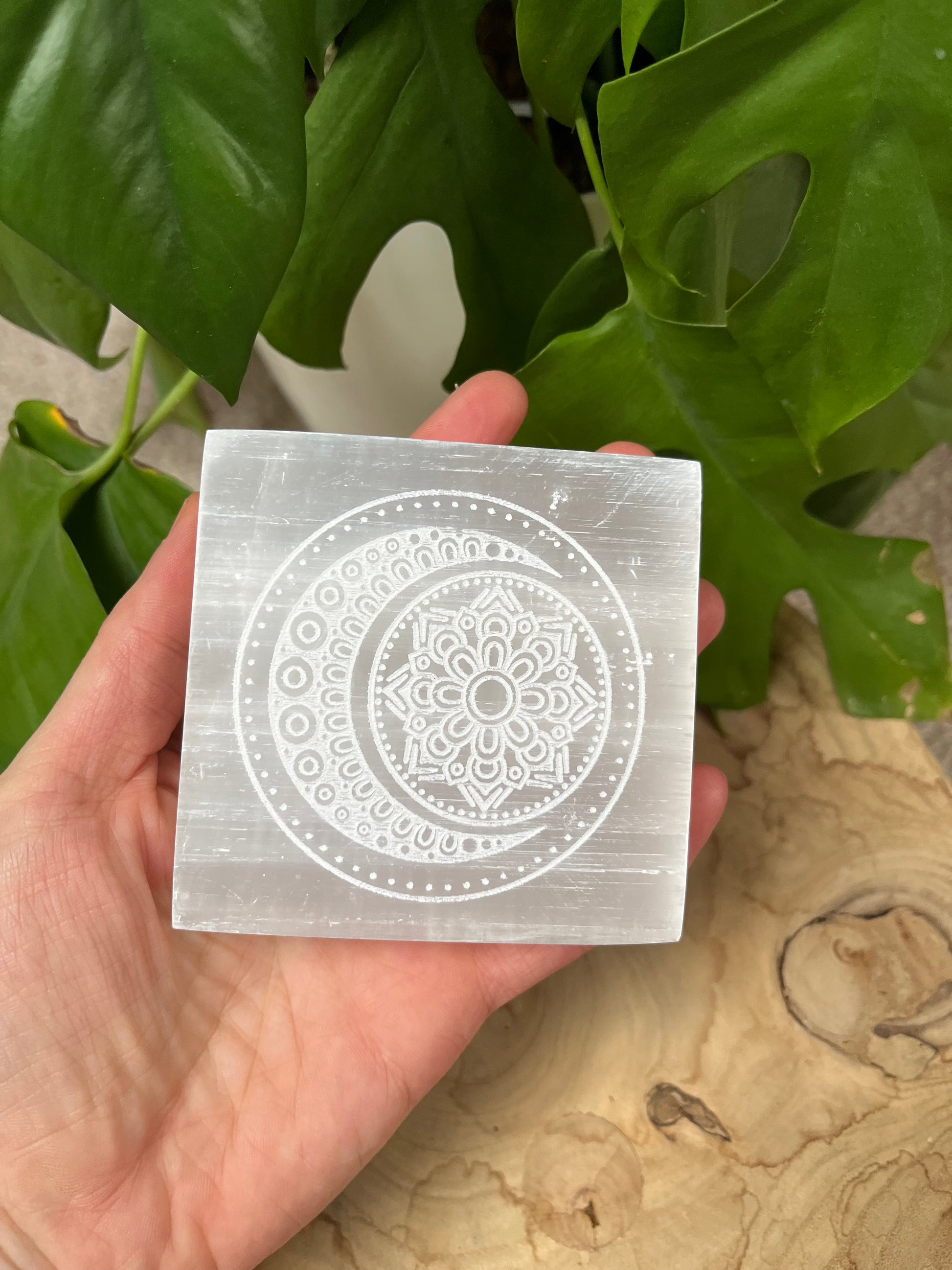 Mit der Selenit Platte kannst du deine Steinchen energetisch aufladen.