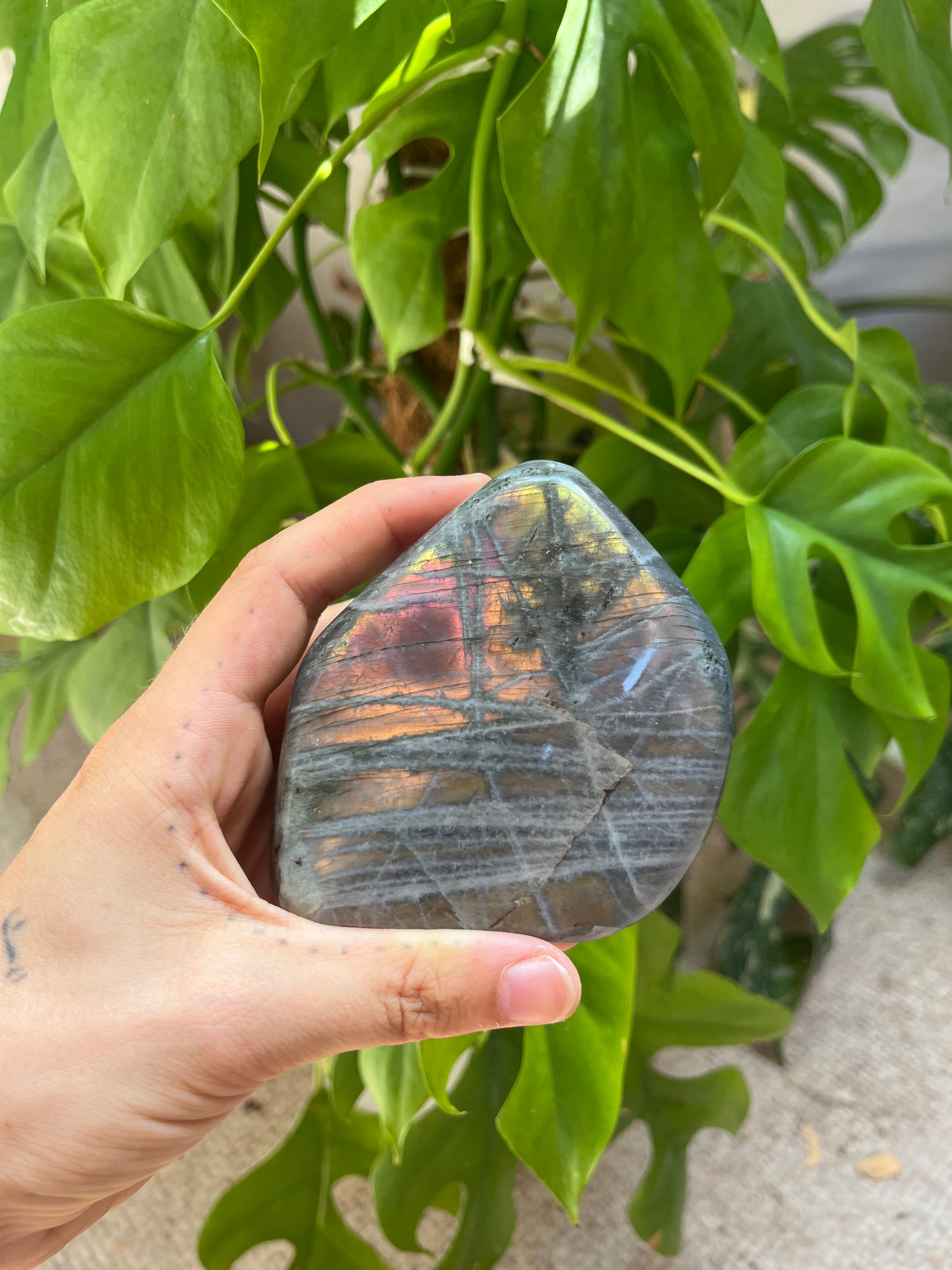 Jede Labradorit Freeform M ist einzigartig geformt und poliert, sodass das Farbspiel je nach Lichteinfall immer wieder anders erscheint – ein echter Hingucker und spiritueller Begleiter.
