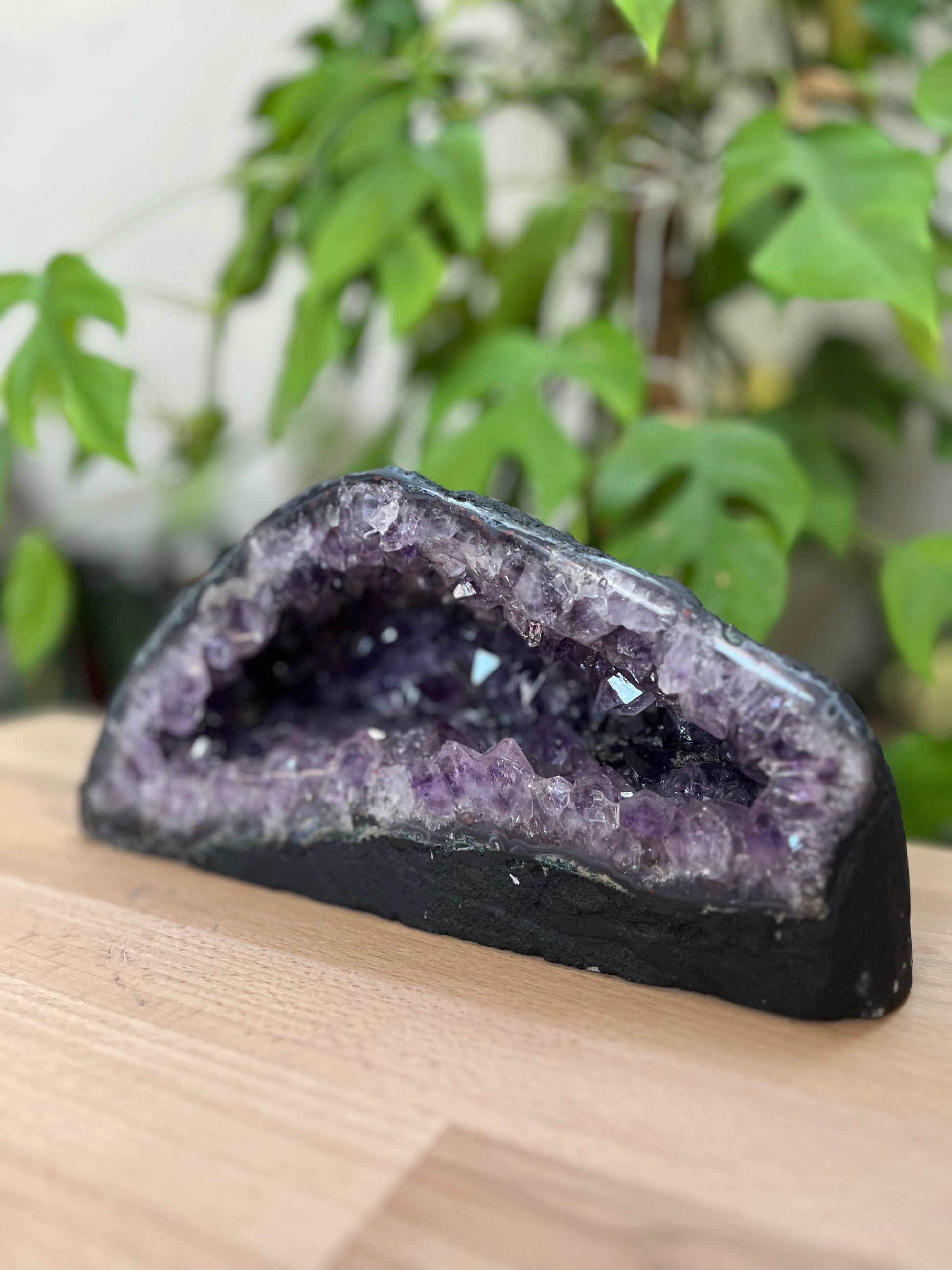 Diese wunderschöne Amethyst Geode in XL Größe mit einem Gewicht von 4,2kg beeindruckt durch ihre breite, offene Höhlenform und ihre tiefvioletten Kristalle.