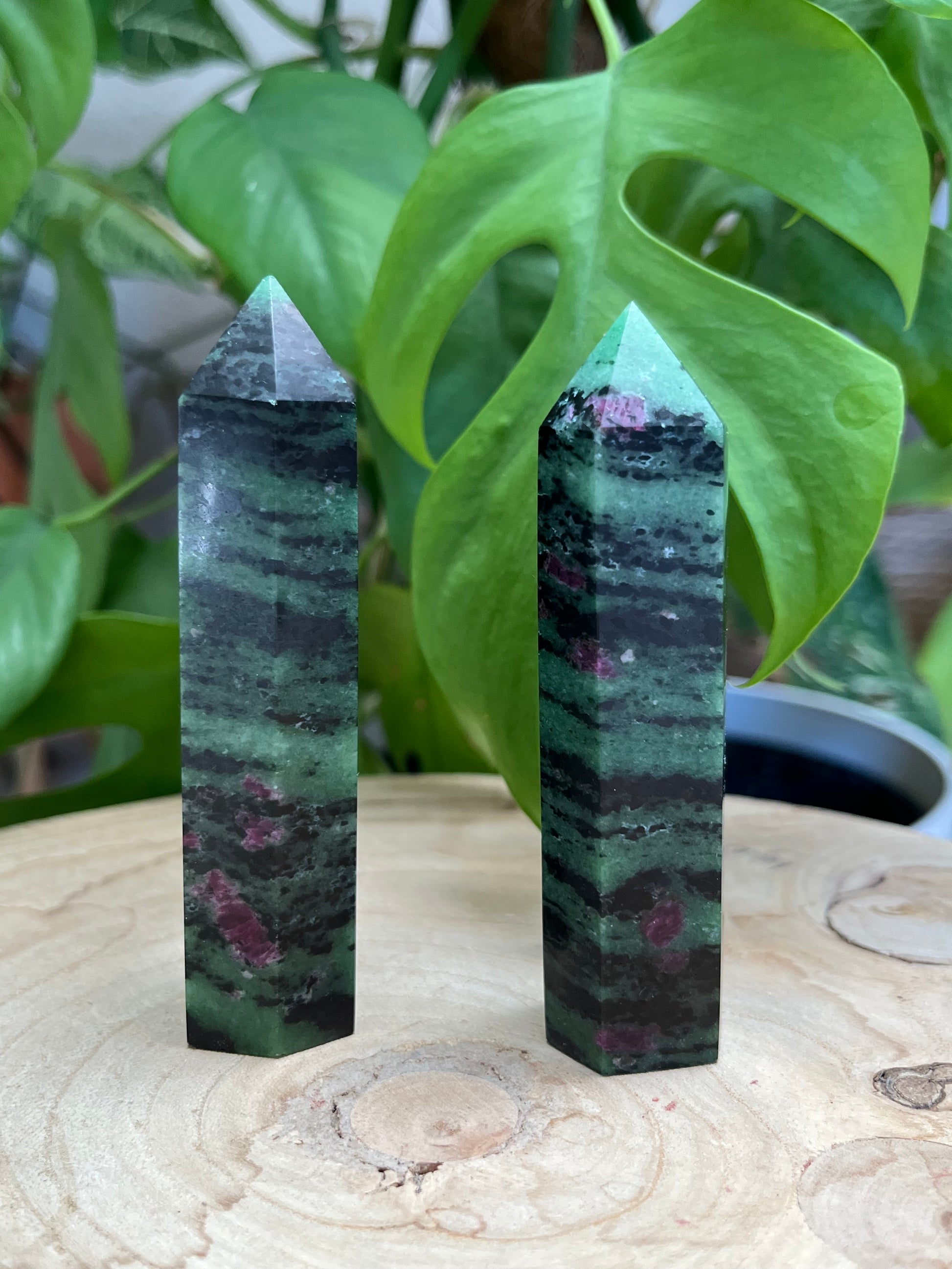 Dieser handgeschliffene Zoisit-mit-Rubin-Turm verbindet das erdige Grün des Zoisits mit den strahlend pinken Einschlüssen von Rubin – eine natürliche Farbkombination voller Ausdruckskraft. Jeder Turm ist ein Unikat mit individuellem Muster und Farbspiel.