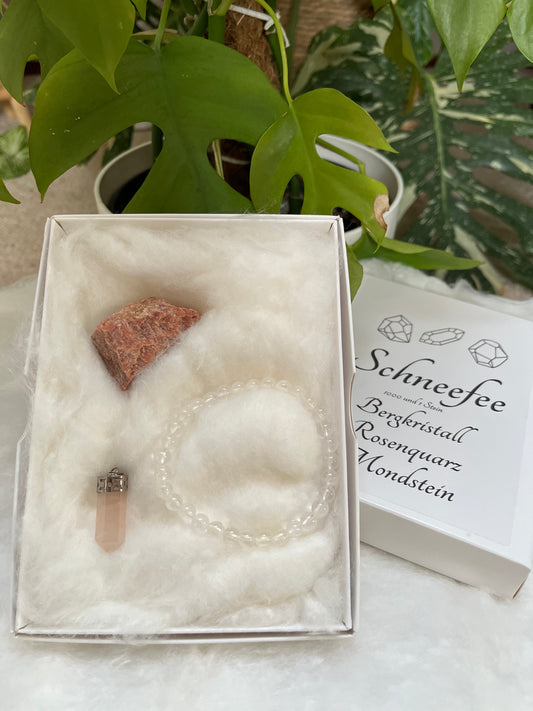 Edelstein-Set „Schneefee“ – Bergkristall, Mondstein & Rosenquarz | Geschenkset